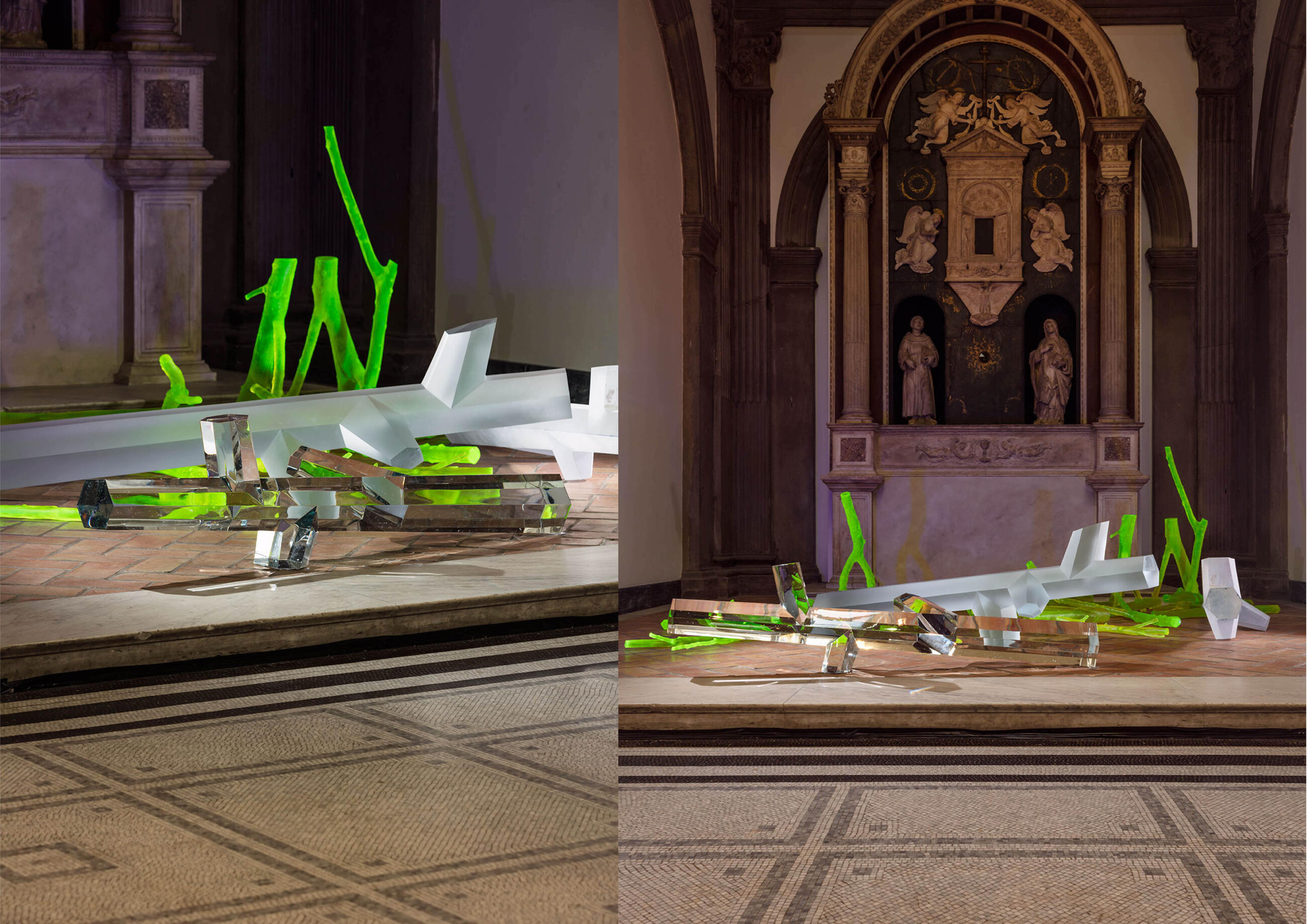 Glass installation for the London Design Festival at Victoria & Albert Museum in 2019. Inspired by the idea of Sacred Geometry, a universal language organizing all visible and invisible reality according to basic geometrical principles, presenting own artistic expression of this system, inspired by thoughts of Czech surrealist Josef Sima and German astronomer and mathematician Johannes Kepler.